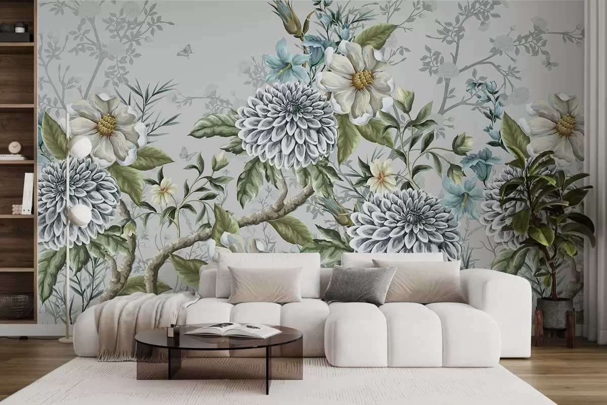 murales de pared Un estampado floral con crisantemos, delicadas flores azules y hojas verdes entrelazadas con ramas w08782