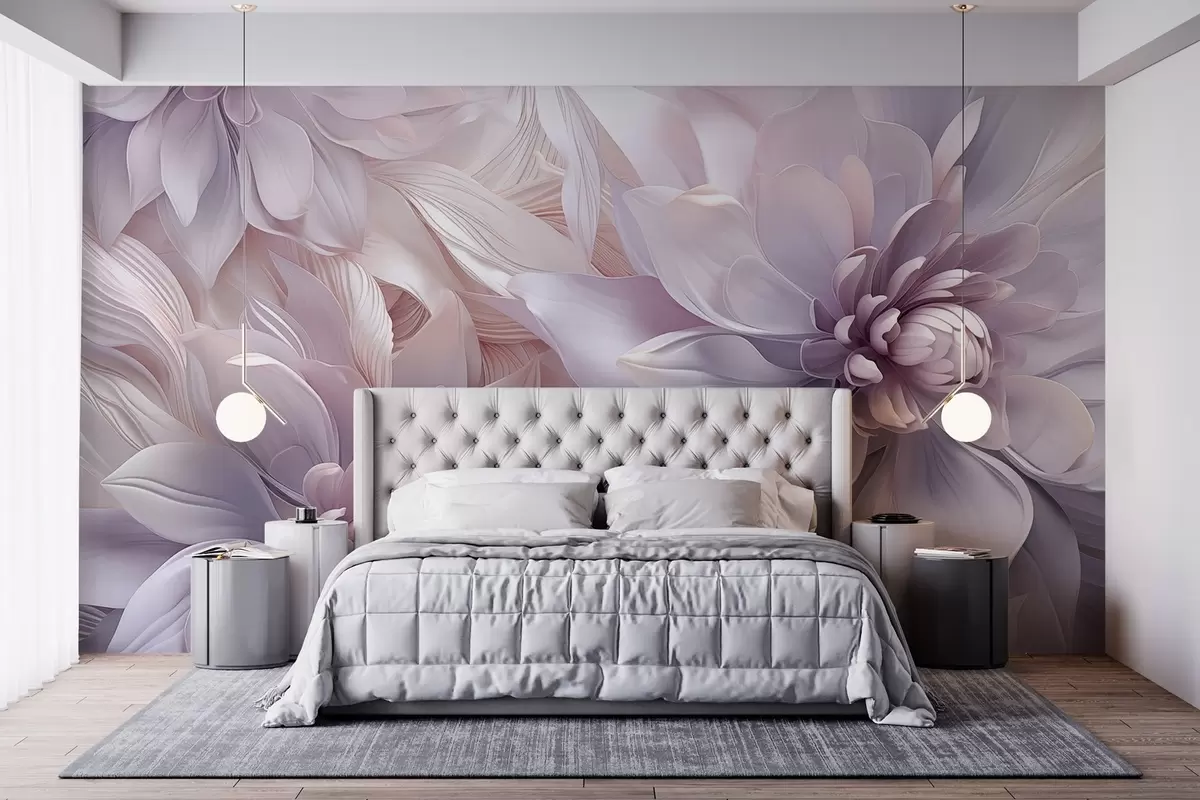 Papel tapiz Flores suaves en capas en tonos rosa pálido, lavanda y blanco con delicados pétalos e intrincados detalles Nr. w08783