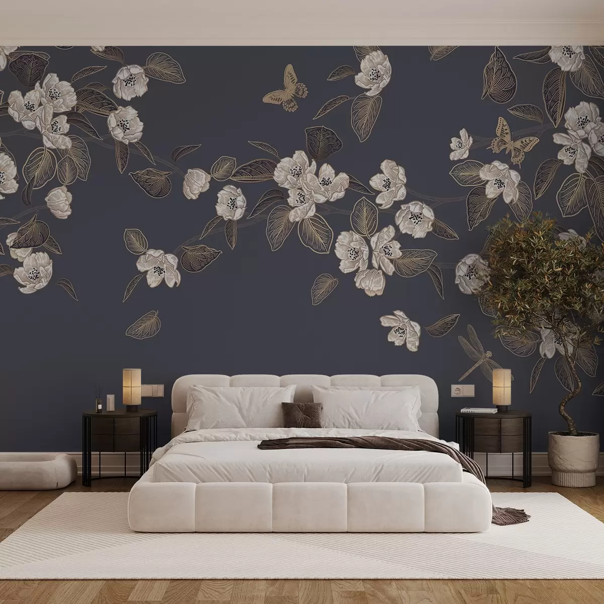 Papel tapiz Flor de cerezo rama con flores, hojas, mariposas sobre un fondo gris oscuro Nr. w08830