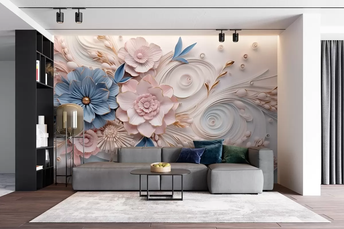 Papel tapiz Una delicada composición floral en tonos rosas y azules con un suave fondo en relieve Nr. w08847