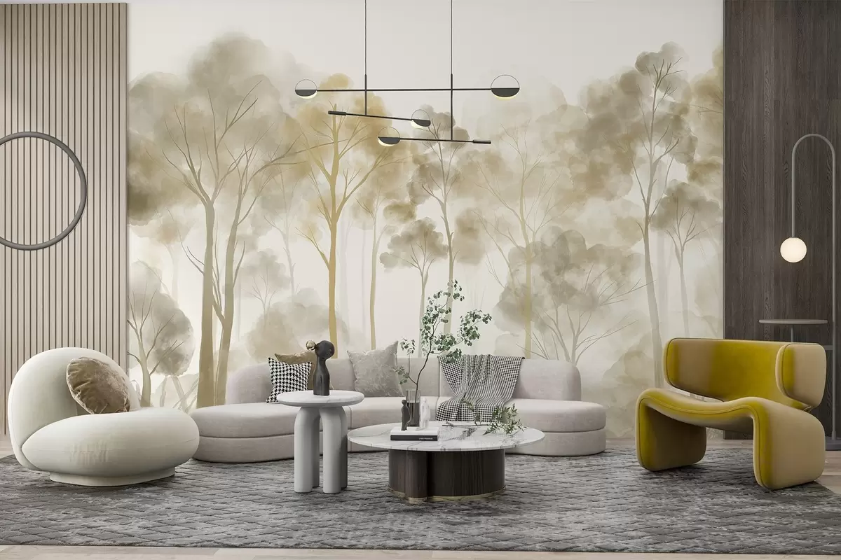Papel tapiz Bosque estilo acuarela con altos árboles claros en tonos beige y amarillo, con una atmósfera de niebla Nr. w08870