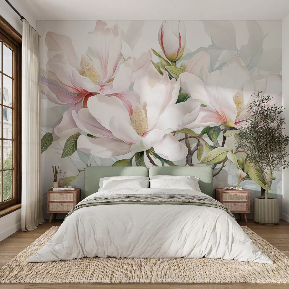 Papel tapiz Flores de magnolia con pétalos blancos y rosas, hojas y ramas marrones, estilo acuarela suave y delicada Nr. w08885