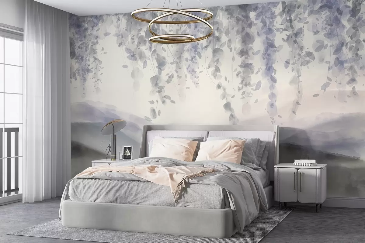 Papel tapiz Hojas de glicina colgando sobre montañas azuladas, suaves colores pastel azul y gris, paisaje estilo acuarela Nr. w08909