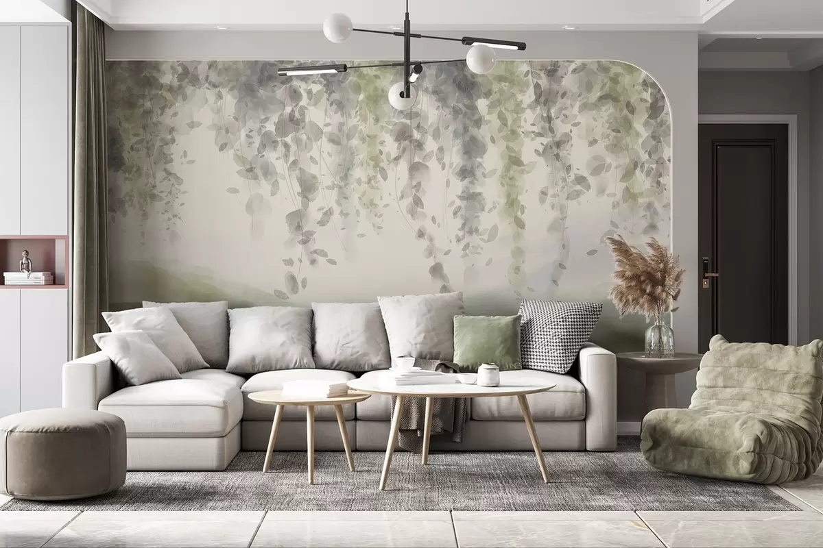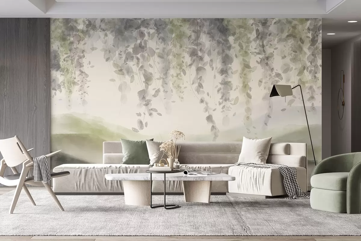 Papel tapiz Hojas de glicina colgando sobre montañas azuladas, suaves colores pastel verde y beige, paisaje estilo acuarela Nr. w08909v2