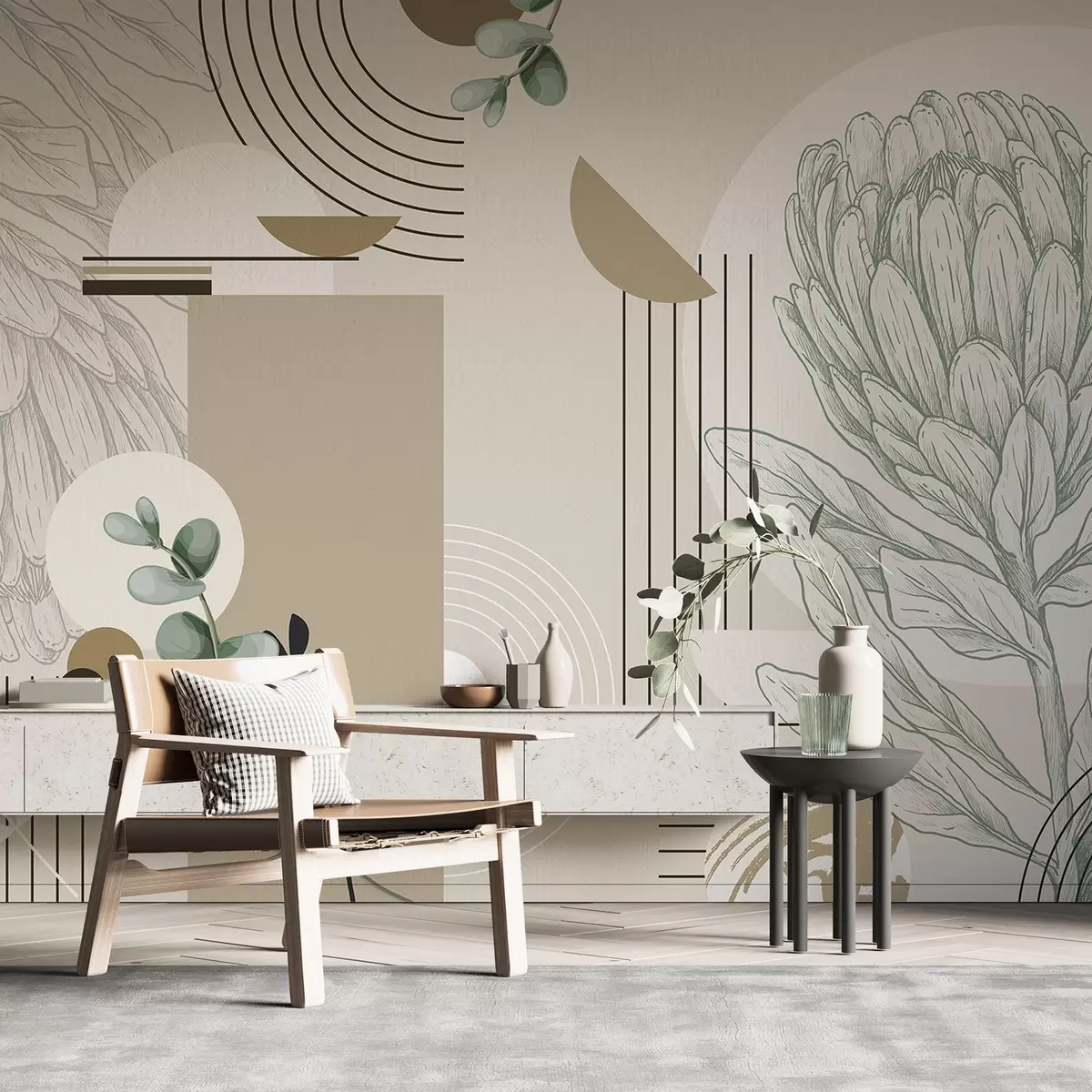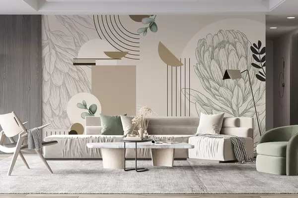 Papel tapiz Estampado botánico abstracto con flor de protea, hojas de eucalipto, formas geométricas en estilo minimalista, colores pastel Nr. w08914