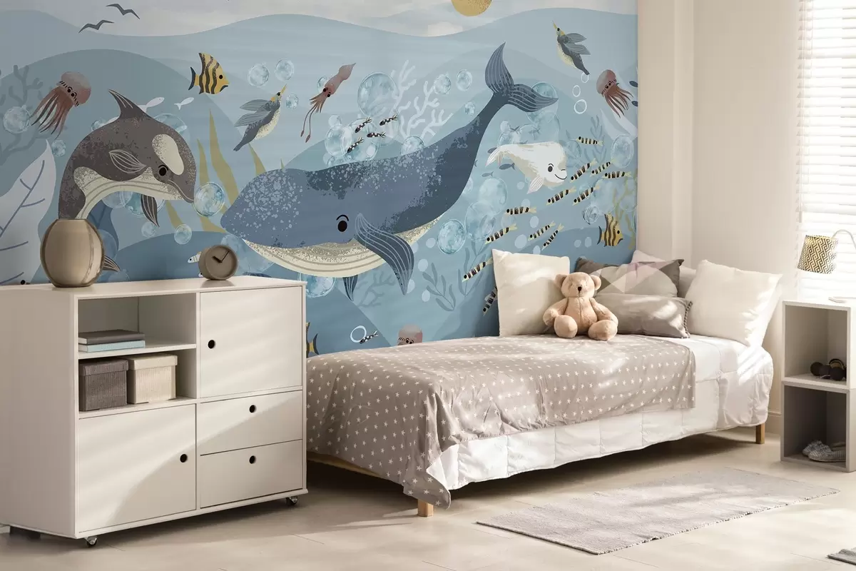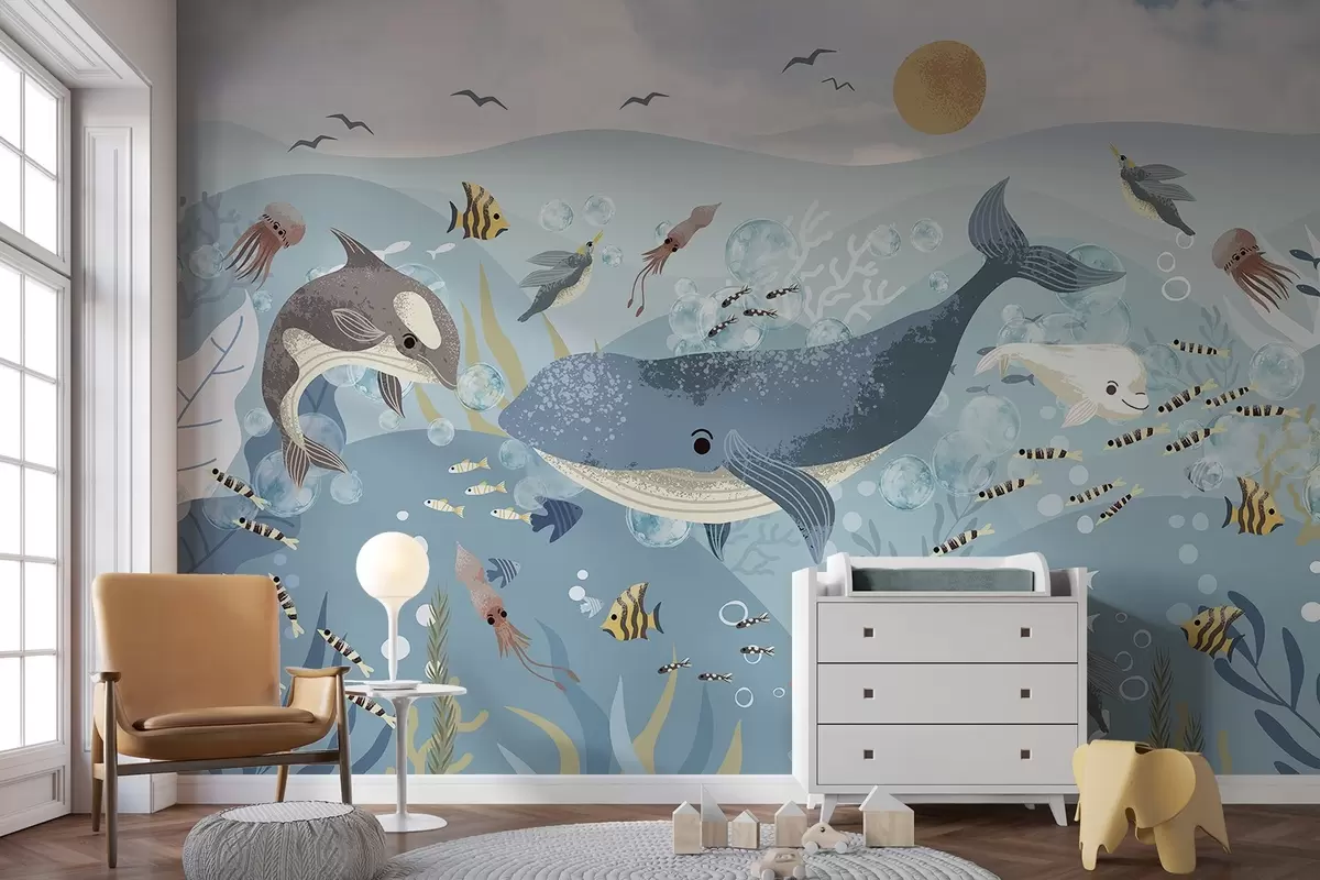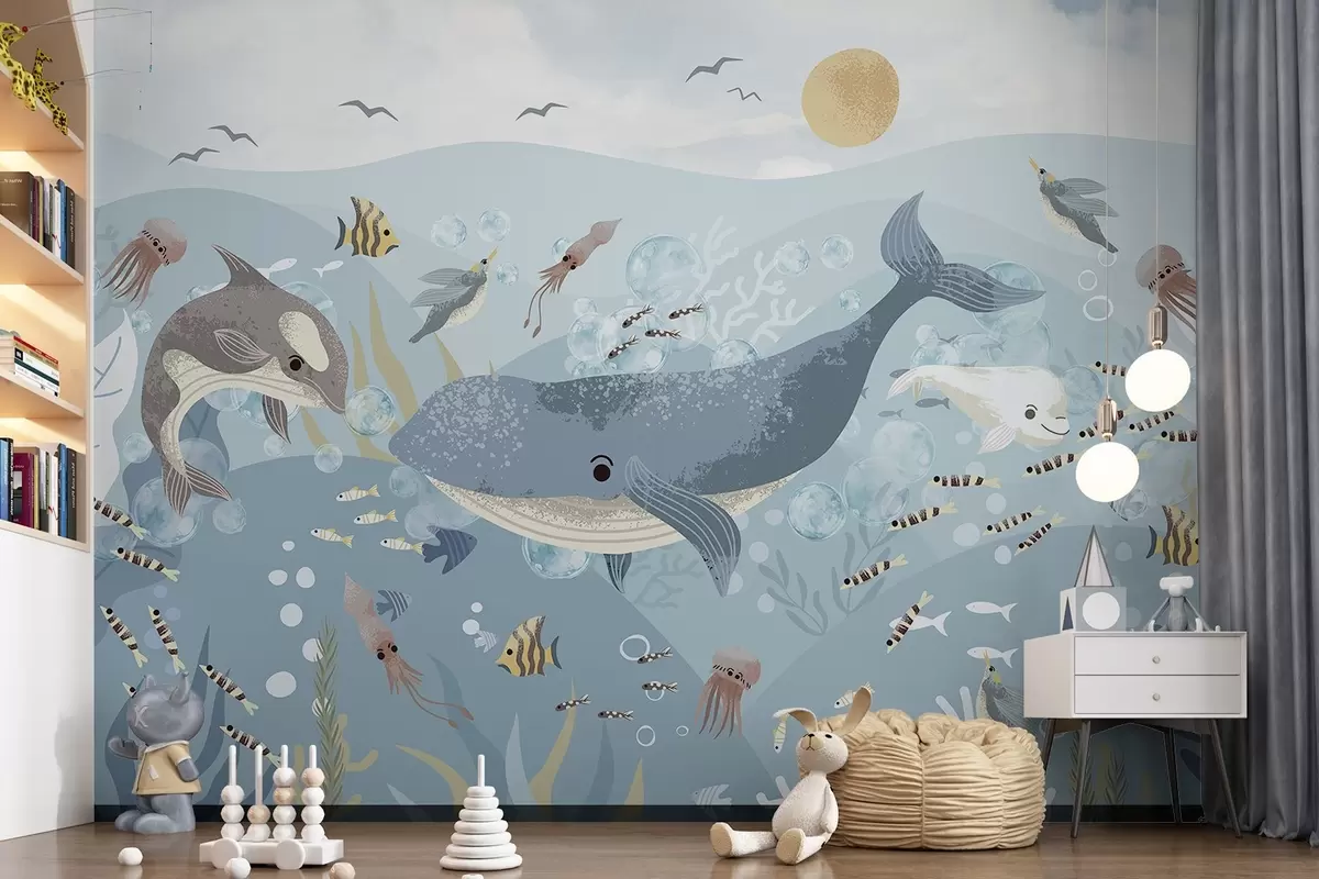 Papel tapiz Ilustración infantil linda impresión con ballena azul rodeada de peces, calamares, medusas en un océano azul con burbujas Nr. w08921