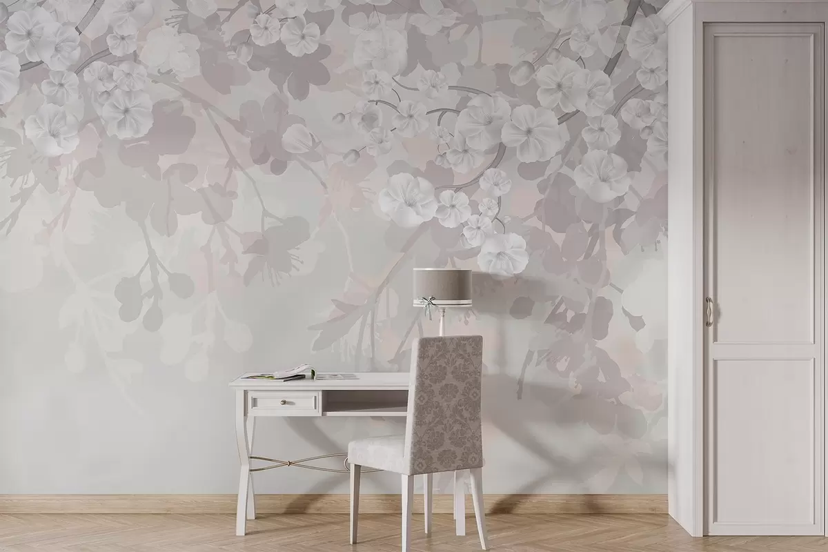 Papel tapiz Ramas de cerezo en flor con flores blancas y hojas grises, sobre elegantes siluetas florales en suaves colores pastel Nr. w08973v1