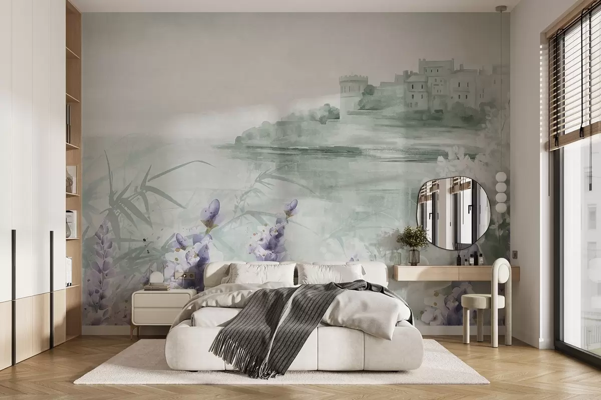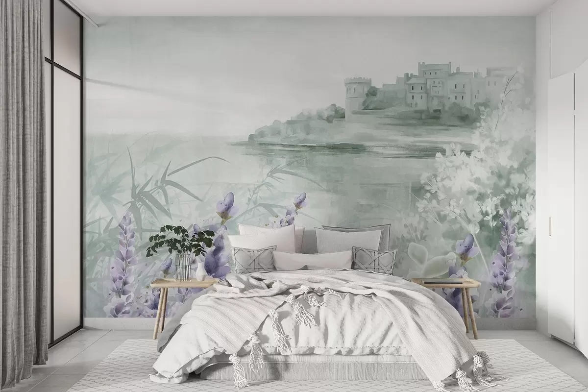 Papel tapiz Paisaje vintage texturizado con un castillo sobre un acantilado con vistas al mar, con flores de lavanda en colores apagados Nr. w08975