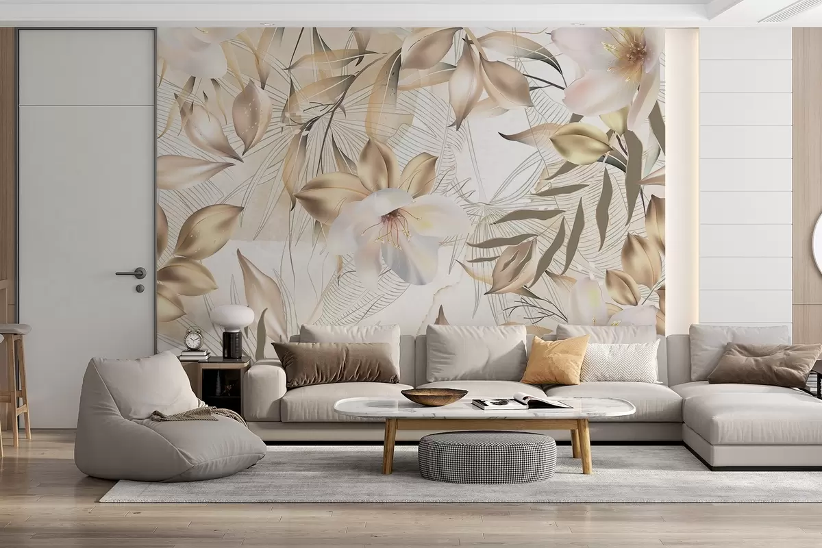 murales de pared Flores y hojas de jazmín, colores suaves, ilustración botánica, fondo floral , diseño elegante, pétalos delicados w08977