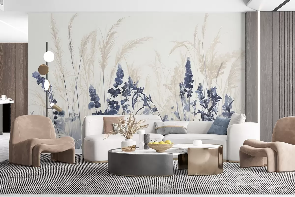 Papel tapiz Flores azules y juncos beige en un campo, textura de pintura minimalista, fondo claro, colores suaves, pinceladas delicadas Nr. w08982