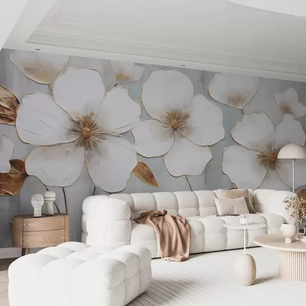 Papel tapiz Grandes flores blancas con hojas amarillas sobre fondo gris Nr. w08999