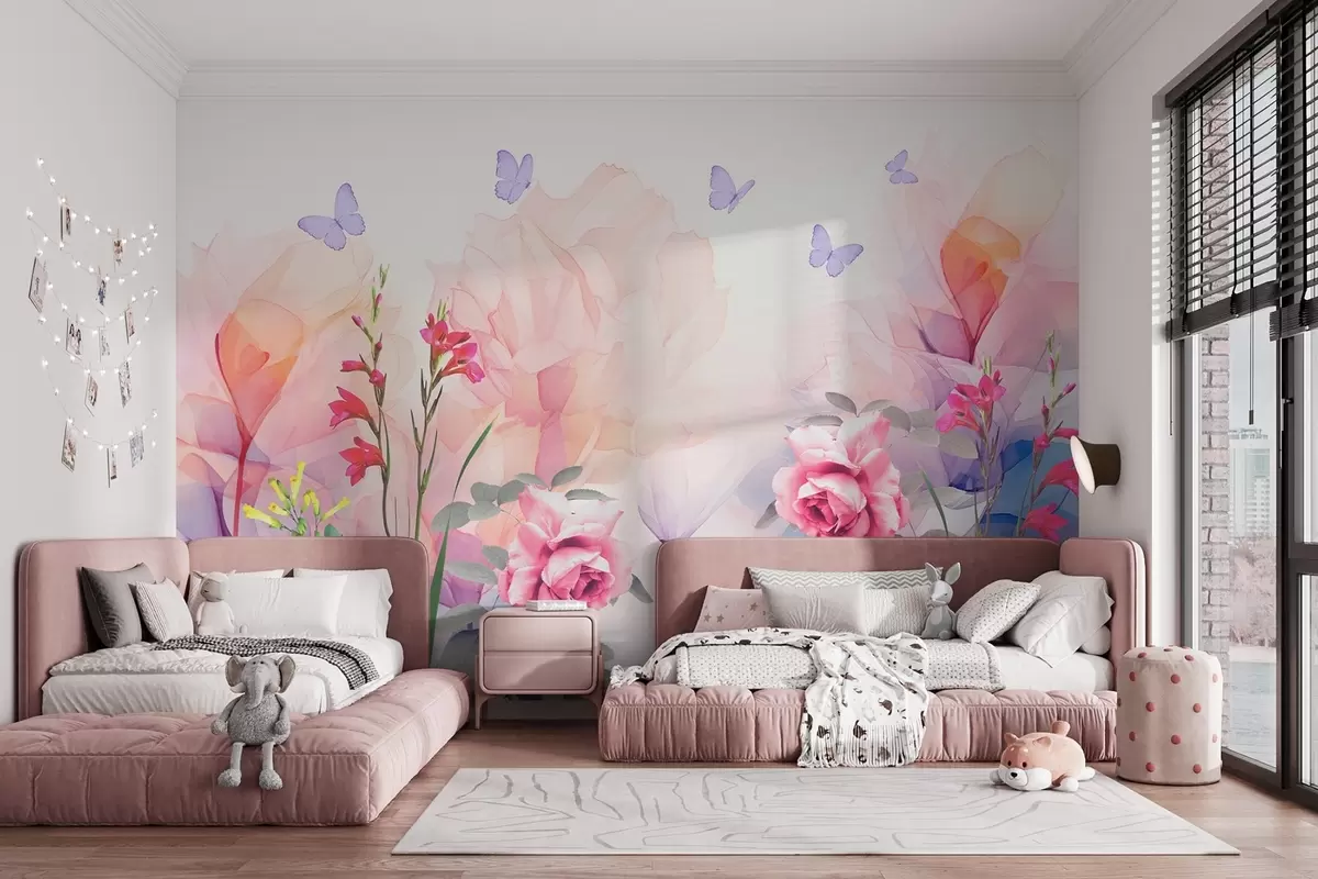 Papel tapiz Flores con mariposas y rosas en estilo acuarela Nr. w09002