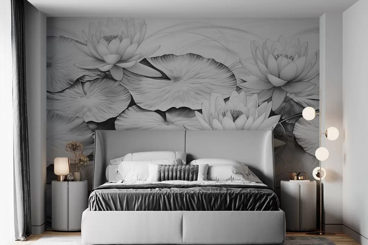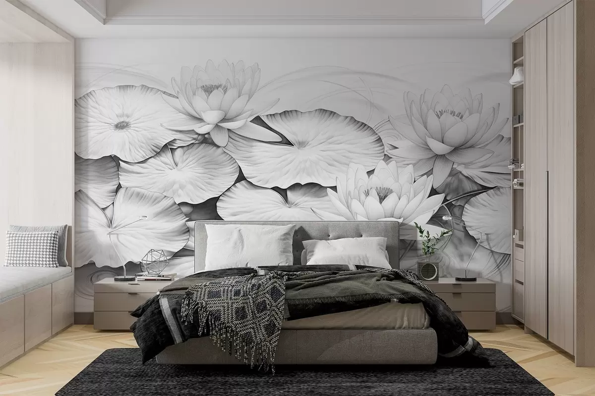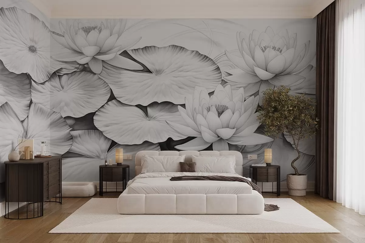 murales de pared Nenúfares y nenúfares en un estanque, imitación en blanco y negro de dibujo a lápiz, ilustración botánica detallada, arte de la naturaleza w09006