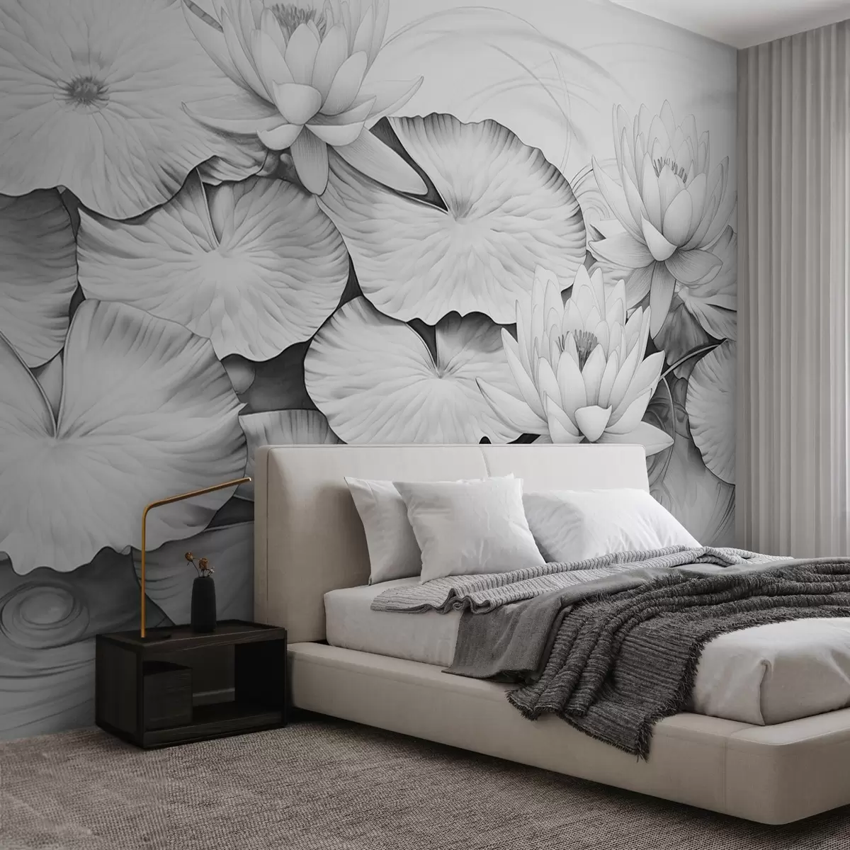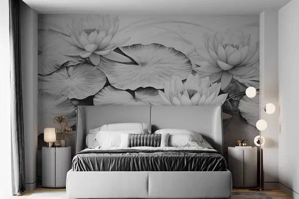 Papel tapiz Nenúfares y nenúfares en un estanque, imitación en blanco y negro de dibujo a lápiz, ilustración botánica detallada, arte de la naturaleza Nr. w09006