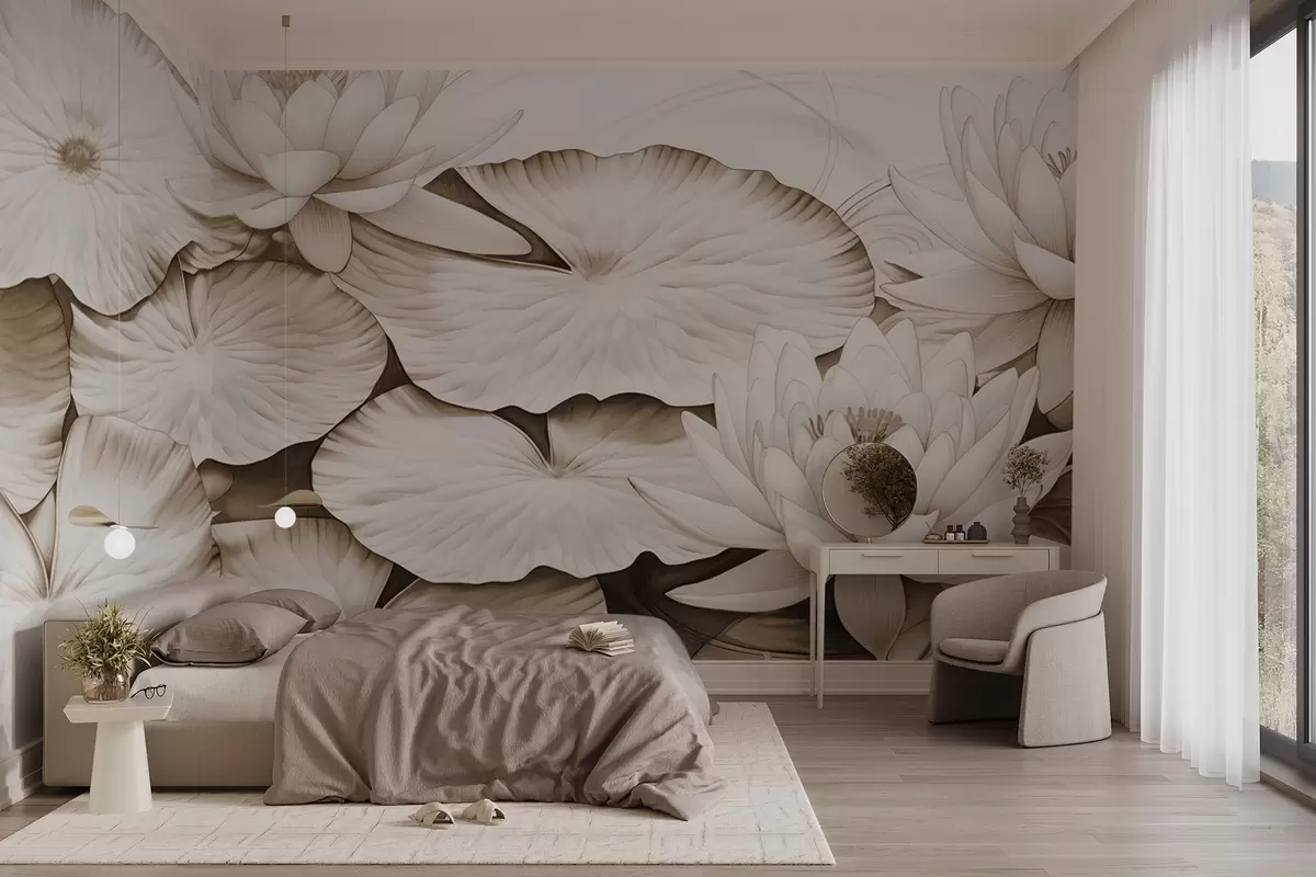 Papel tapiz Nenúfares y nenúfares en un estanque, marrón y blanco imitación de dibujo a lápiz, ilustración botánica detallada, arte de la naturaleza Nr. w09006v2