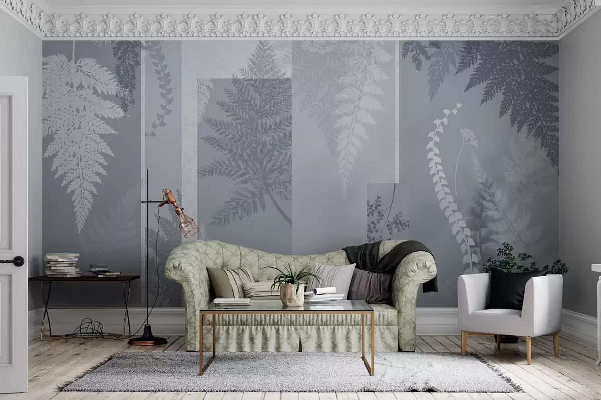Papel tapiz Hojas de helecho en azul y blanco, dispuestas en rayas verticales, creando un estampado botánico y minimalista, de colores suaves y apagados Nr. w09007v1