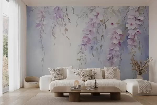 Papel tapiz Flores de glicinia con pétalos lilas y hojas verdes colgando de las ramas, suaves colores pastel, fondo color pastel Nr. w09010