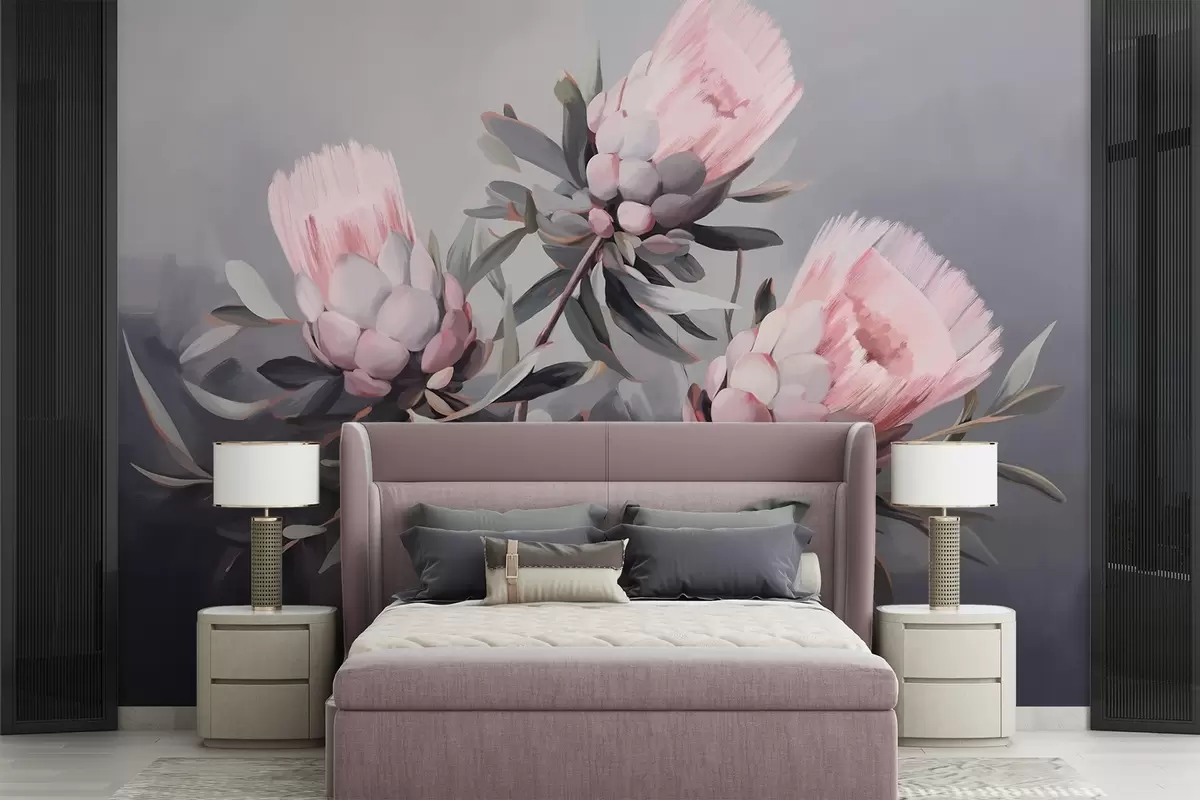 Papel tapiz Flores abstractas de protea rosa con hojas grises, pinceladas de textura suave, colores apagados, sobre fondo gris difuminado Nr. w09014