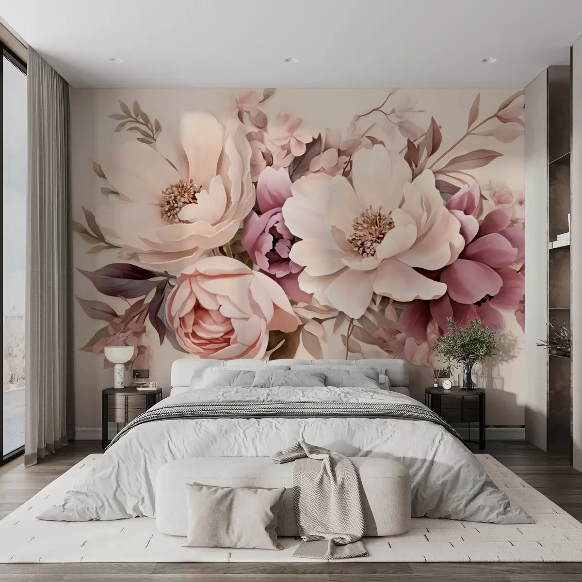 Papel tapiz Delicada composición de flores rosas y beige, peonías con hojas Nr. w09019