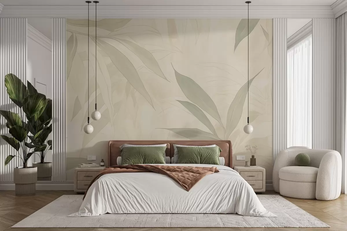 Papel tapiz Ramas con hojas en suaves tonos verdes sobre fondo beige Nr. w09027