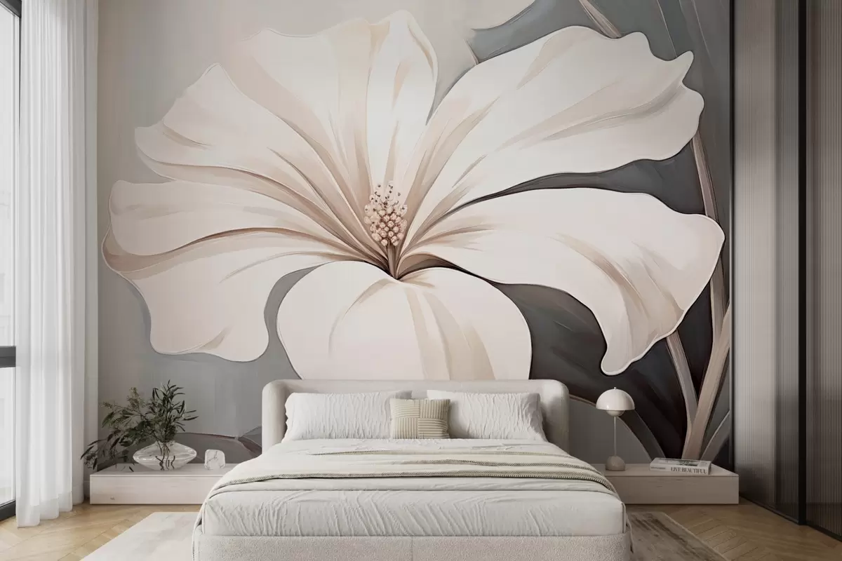 Papel tapiz Gran flor blanca con pétalos sobre fondo azul grisáceo Nr. w09033