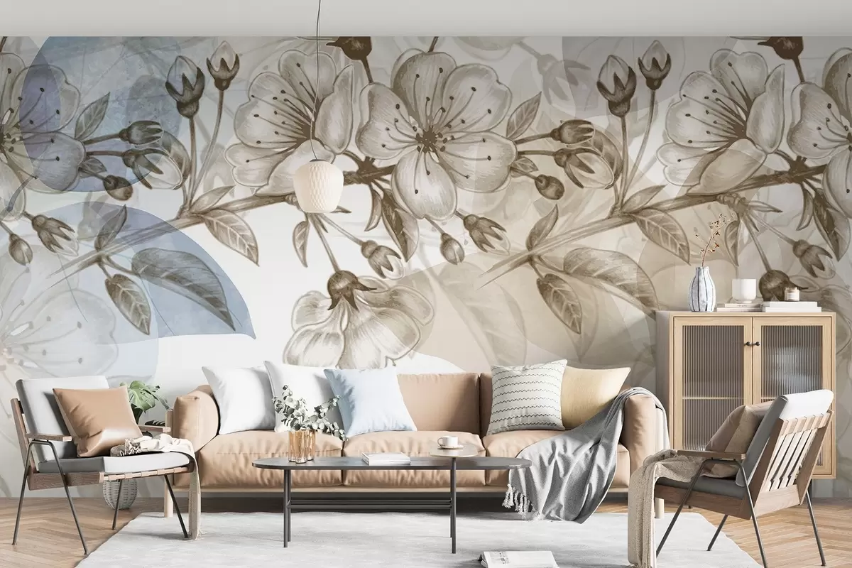 Papel tapiz Ramo de cerezo con flores y capullos, tonos sepia, fondo suave tipo acuarela con tonos azules y marrones Nr. w09051