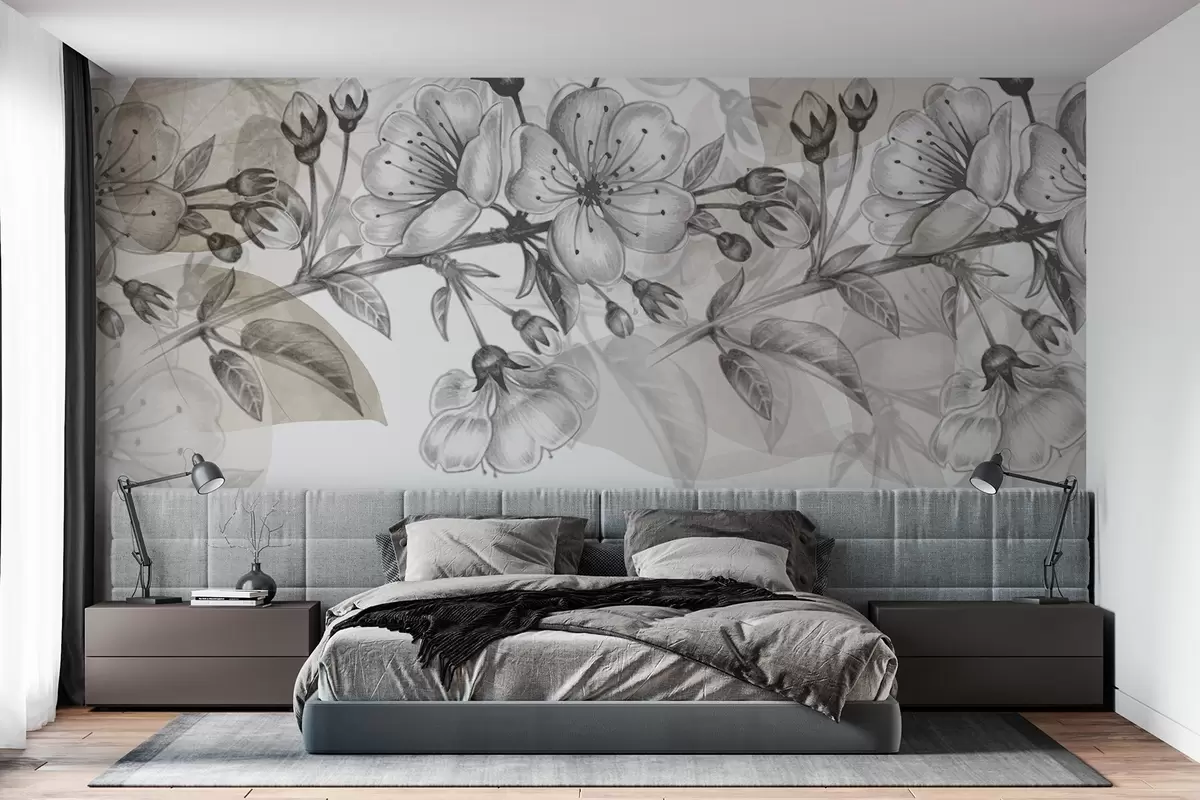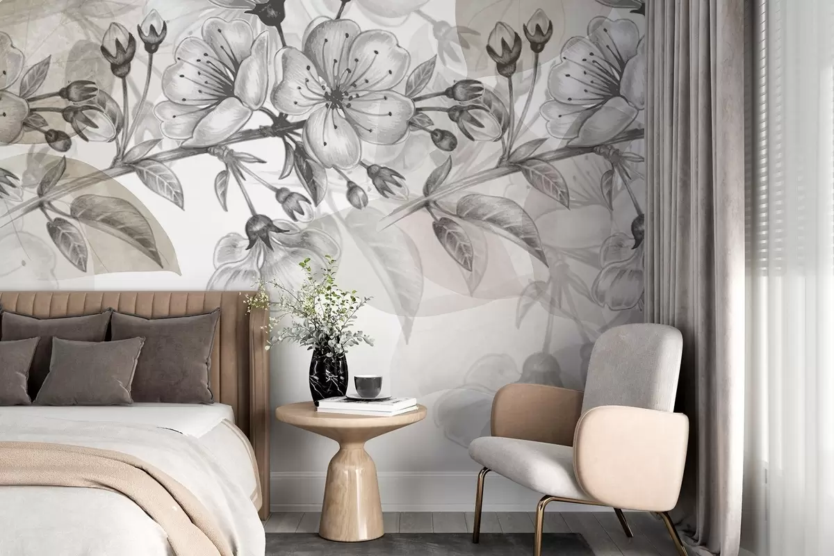 Papel tapiz Ramo de cerezo con flores y capullos, tonos sepia, fondo suave tipo acuarela con tonos grises y marrones Nr. w09051v1