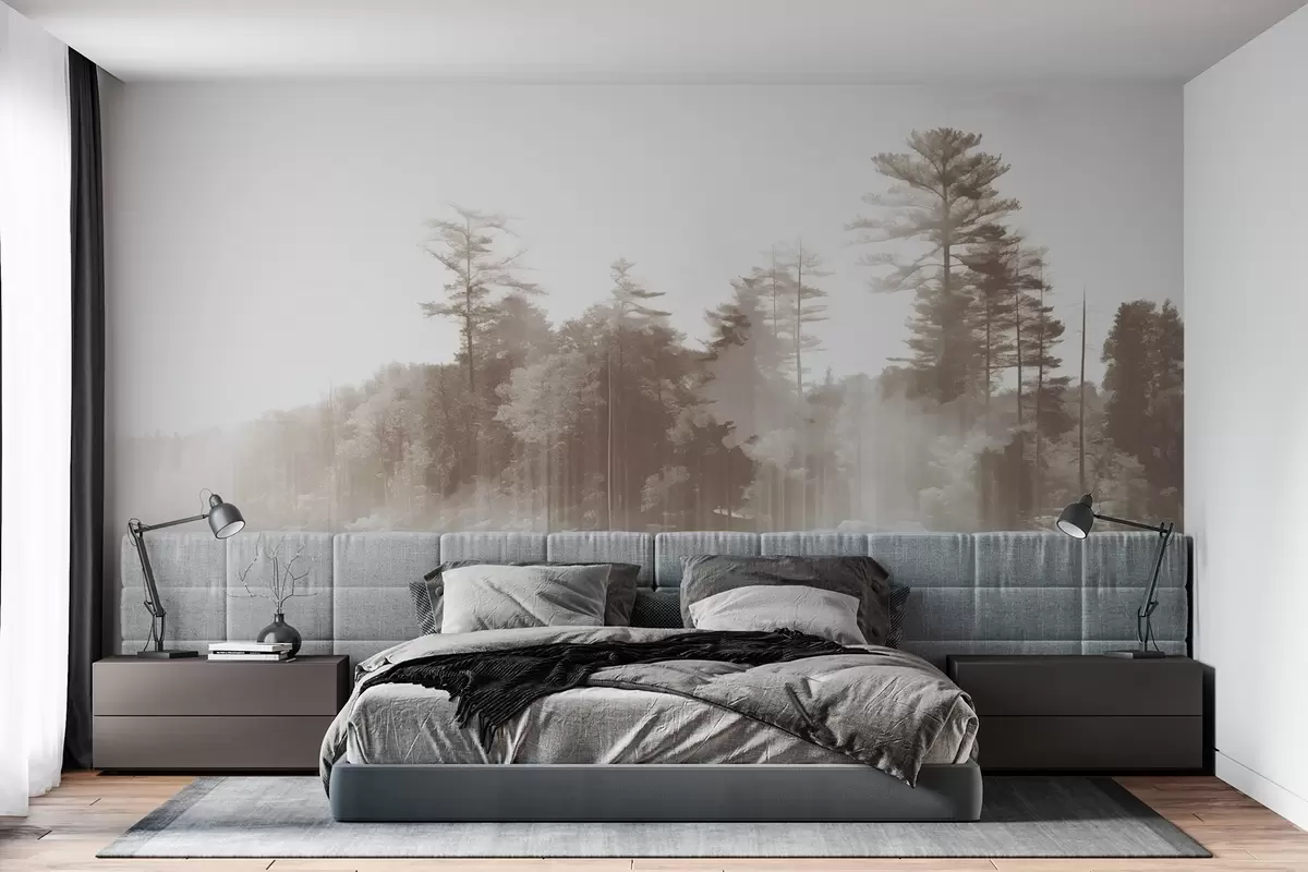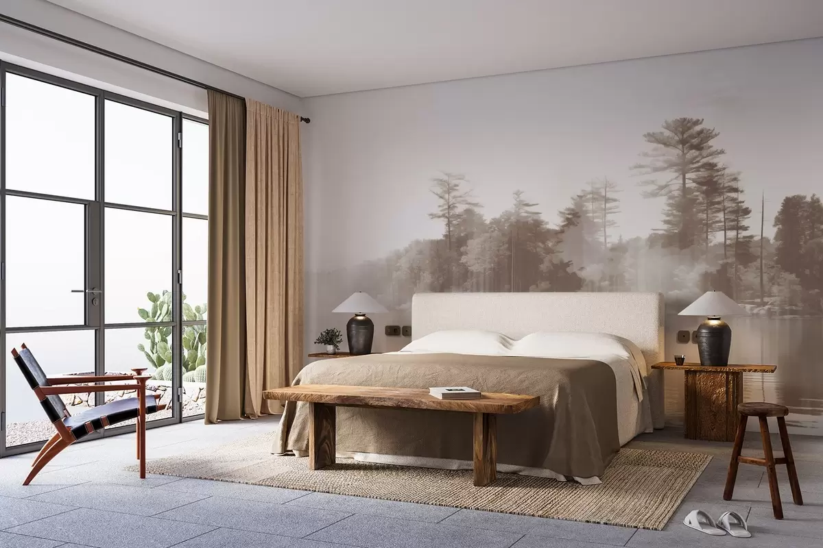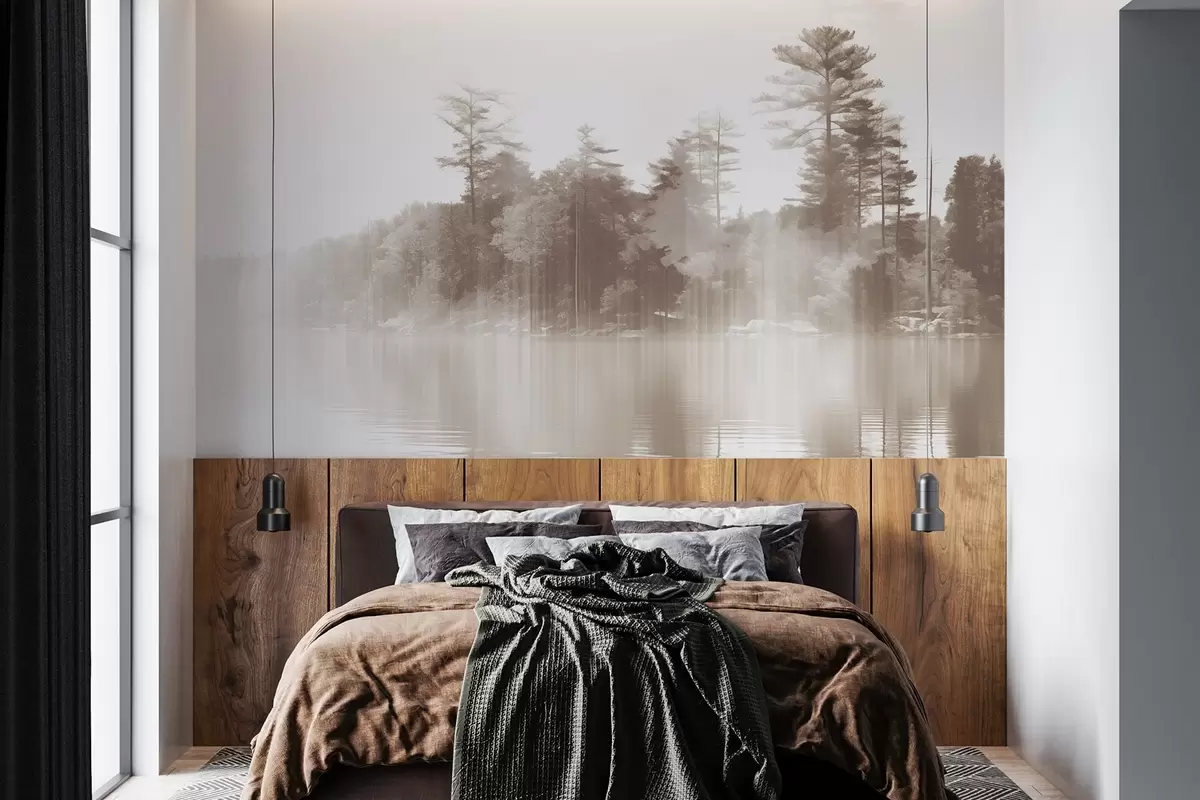 Papel tapiz Paisaje abstracto minimalista texturizado con un lago y árboles reflejados en el agua en tonos beige y blanco Nr. w09058v1