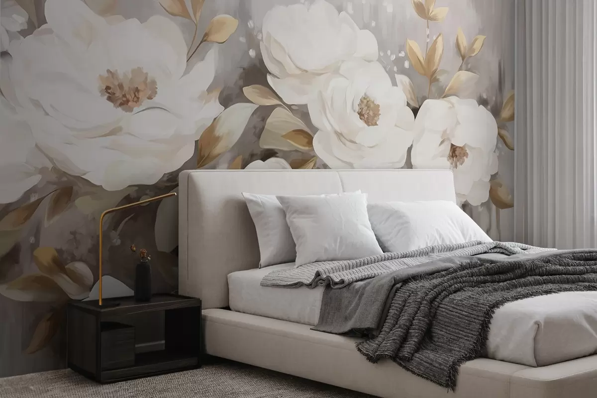 Papel tapiz Flores blancas con hojas amarillas, pétalos suaves, delicado arreglo floral, paleta de colores neutros, pinceladas texturizadas Nr. w09062