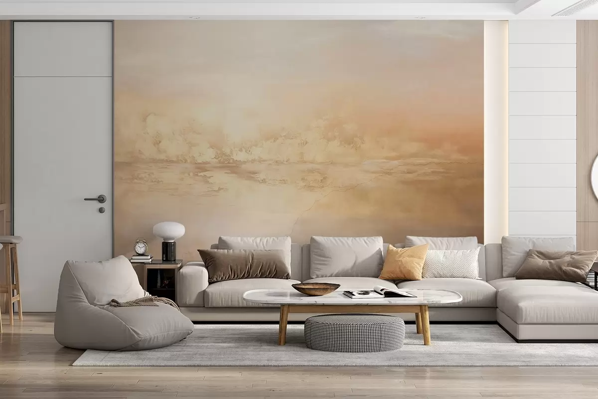 Papel tapiz Paisaje abstracto texturizado con colores cálidos, una atmósfera suave y soñadora y una mezcla de tonos naranjas, amarillos y blancos Nr. w09063