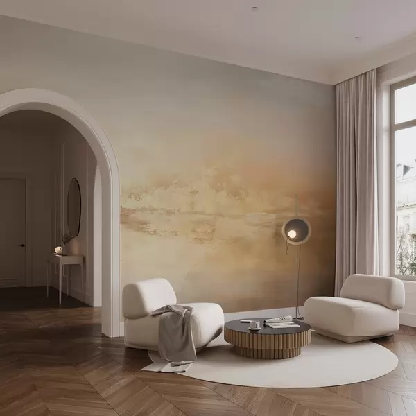 murales de pared Paisaje abstracto texturizado con colores cálidos, una atmósfera suave y soñadora y una mezcla de tonos naranjas, amarillos y blancos w09063