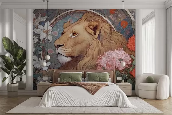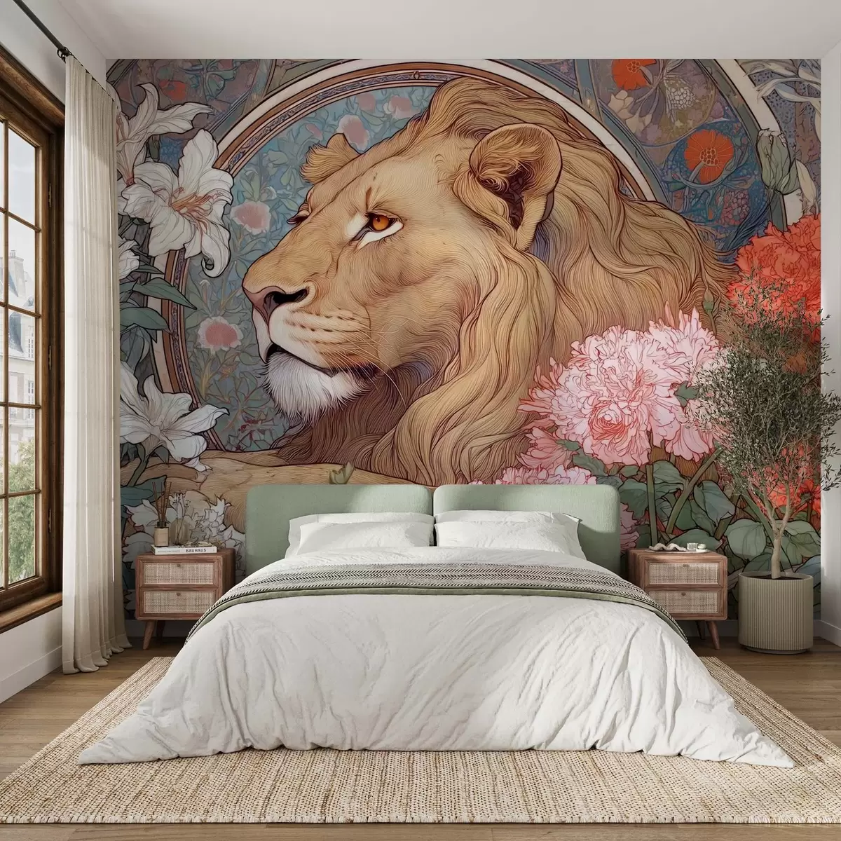 Papel tapiz Un león rodeado de muchas flores al estilo de Alphonse Mucha Nr. w09073