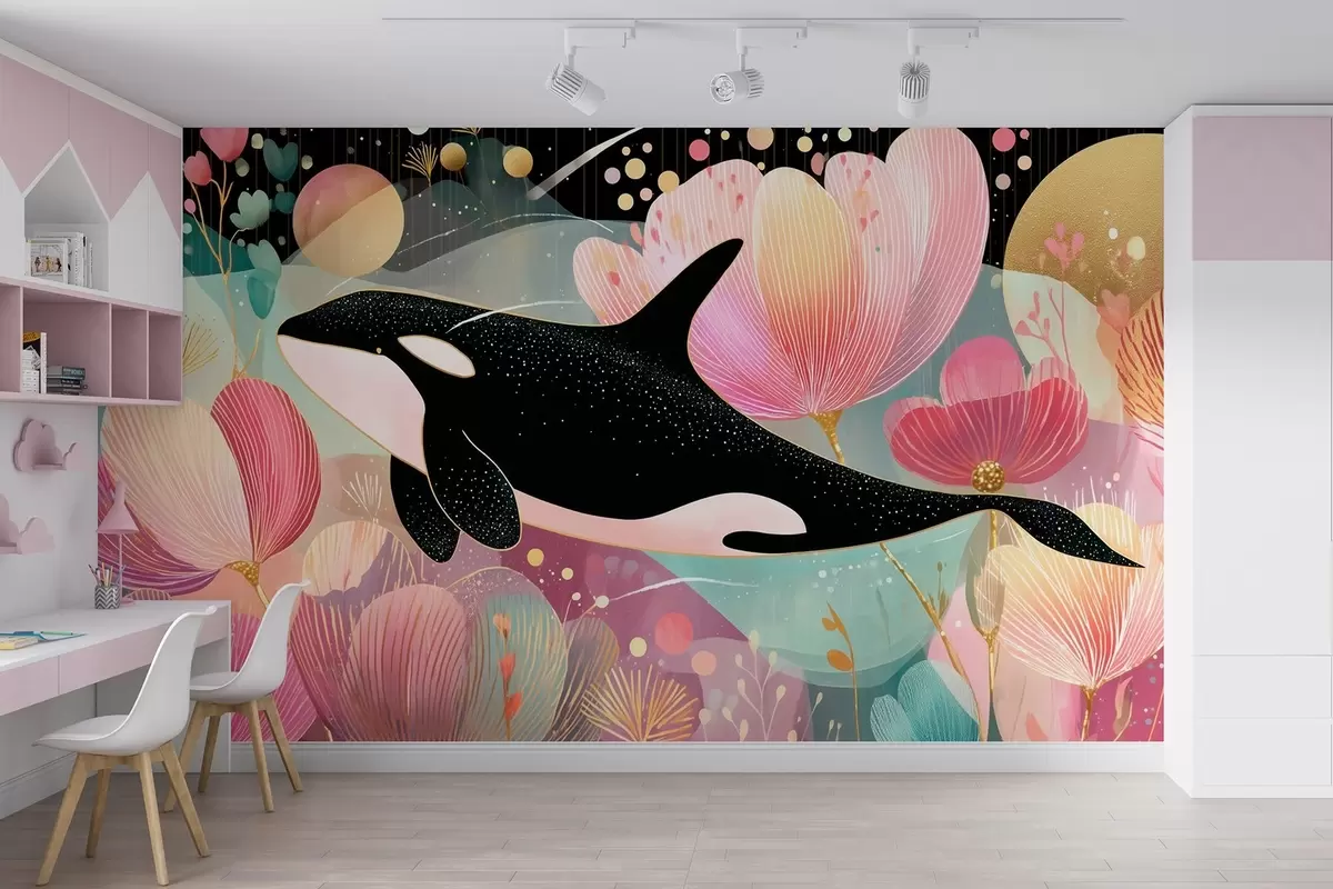 Papel tapiz Una orca negra nadando sobre un fondo de flores rosas Nr. w09074