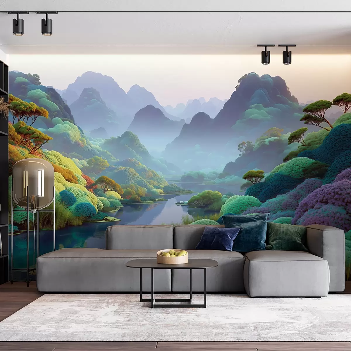 Papel tapiz Paisaje de montaña con un río en tonos azules con árboles y arbustos Nr. w09088