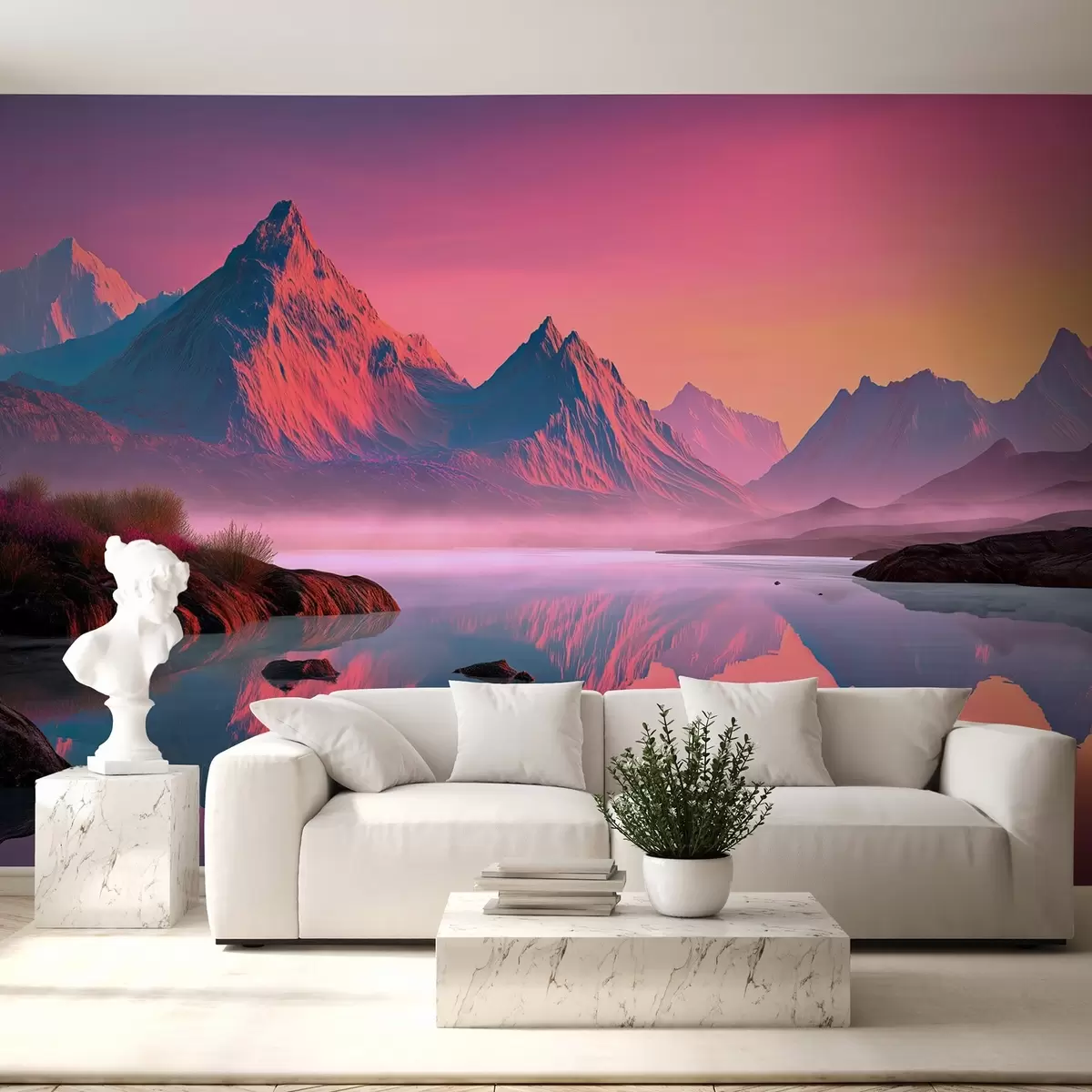 Papel tapiz Romántico paisaje al atardecer con un río y montañas en tonos rosados Nr. w09093