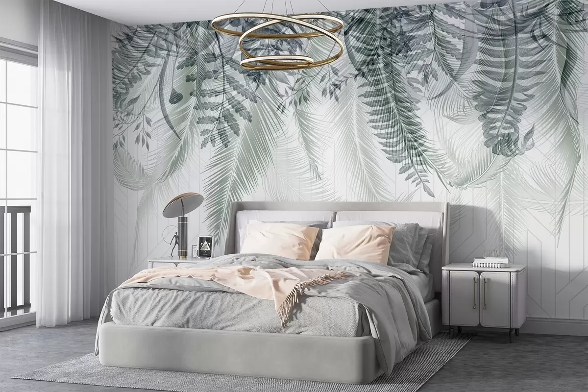 Papel tapiz Delicada caída de helechos tropicales y hojas de palmera, fondo geométrico, luz suave, colores apagados, elegante Nr. w09106