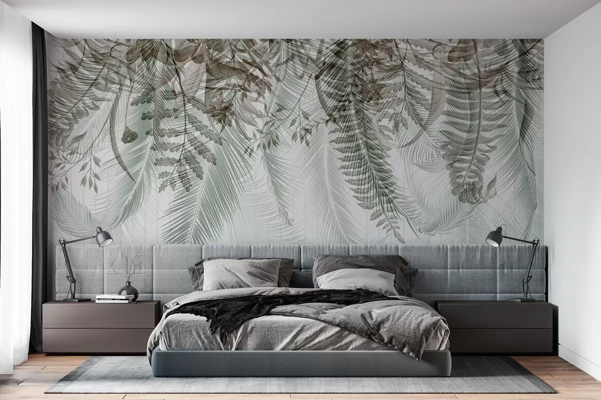 Papel tapiz Delicada caída de helechos tropicales y hojas de palmera, fondo geométrico, luz suave, colores apagados, elegante Nr. w09106v1