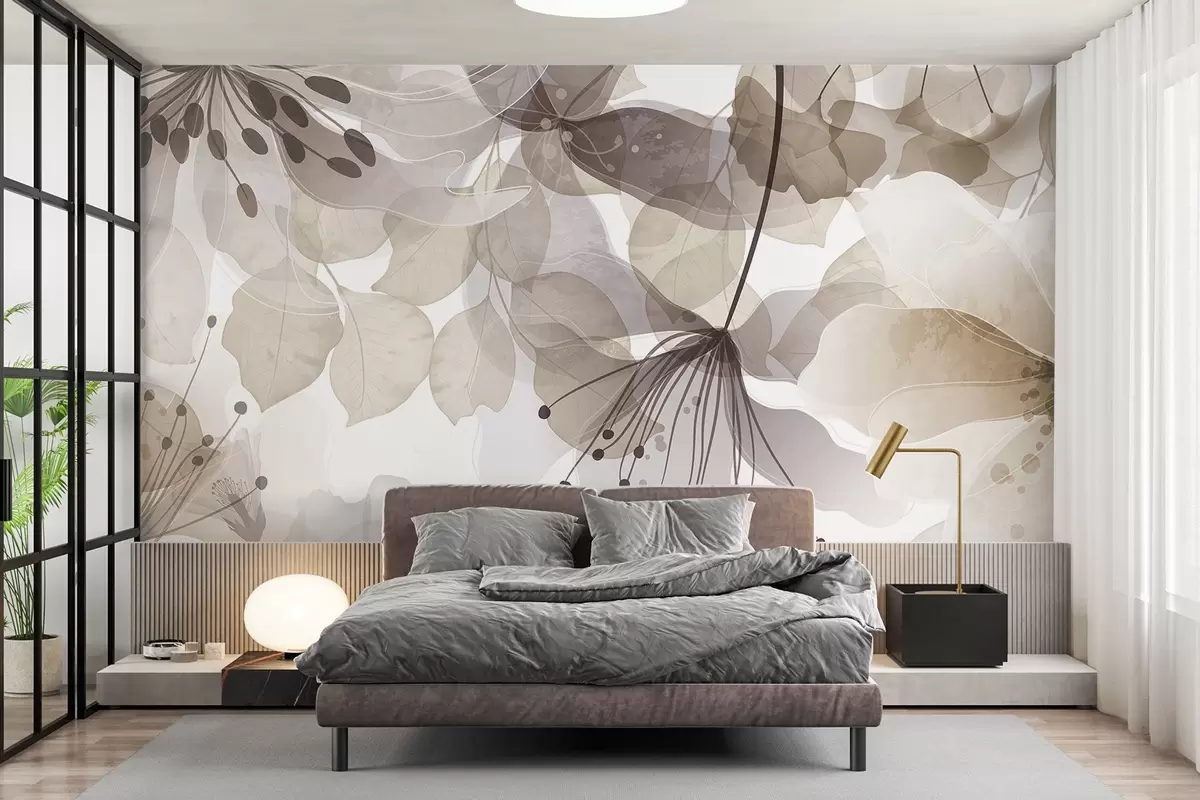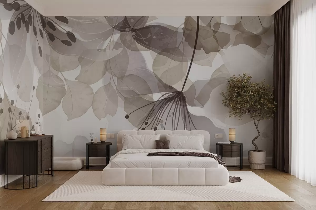 Papel tapiz Flores y hojas en colores beige, pétalos y hojas translúcidos, suave efecto acuarela, líneas delicadas, fondo blanco Nr. w09107v1