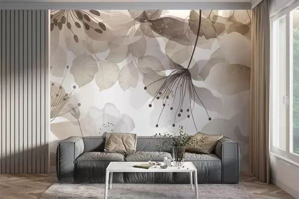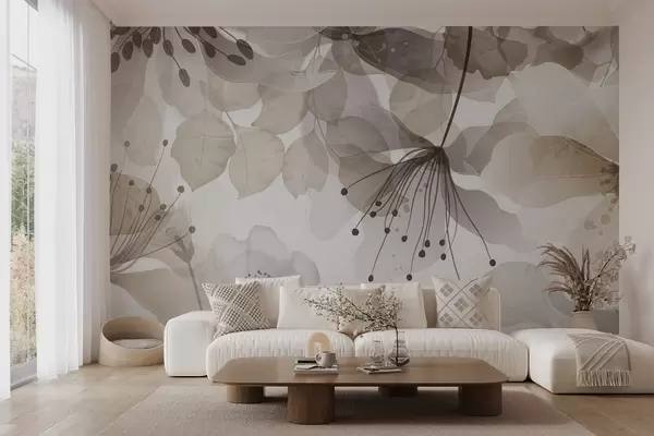 Papel tapiz Flores y hojas en colores beige, pétalos y hojas translúcidos, suave efecto acuarela, líneas delicadas, fondo blanco Nr. w09107v1