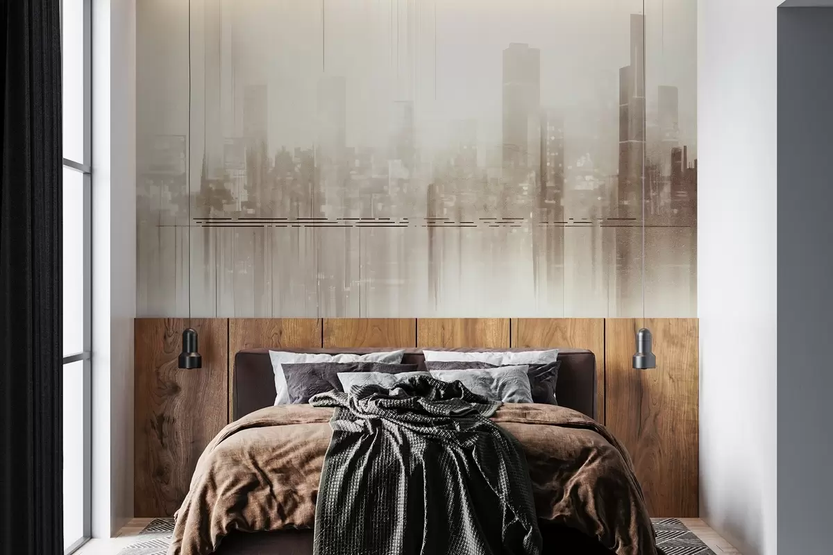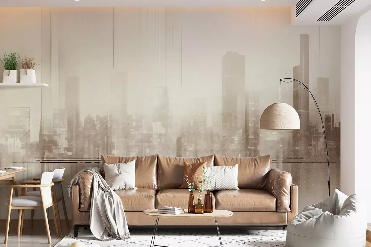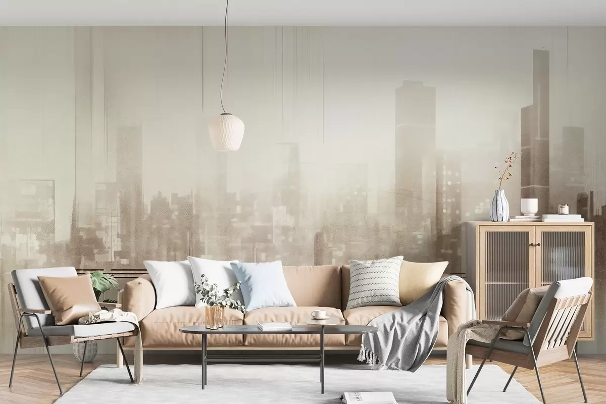 Papel tapiz Paisaje urbano abstracto texturizado con edificios altos y bandas, en tonos beige y blanco, creando un efecto brumoso Nr. w09119v1