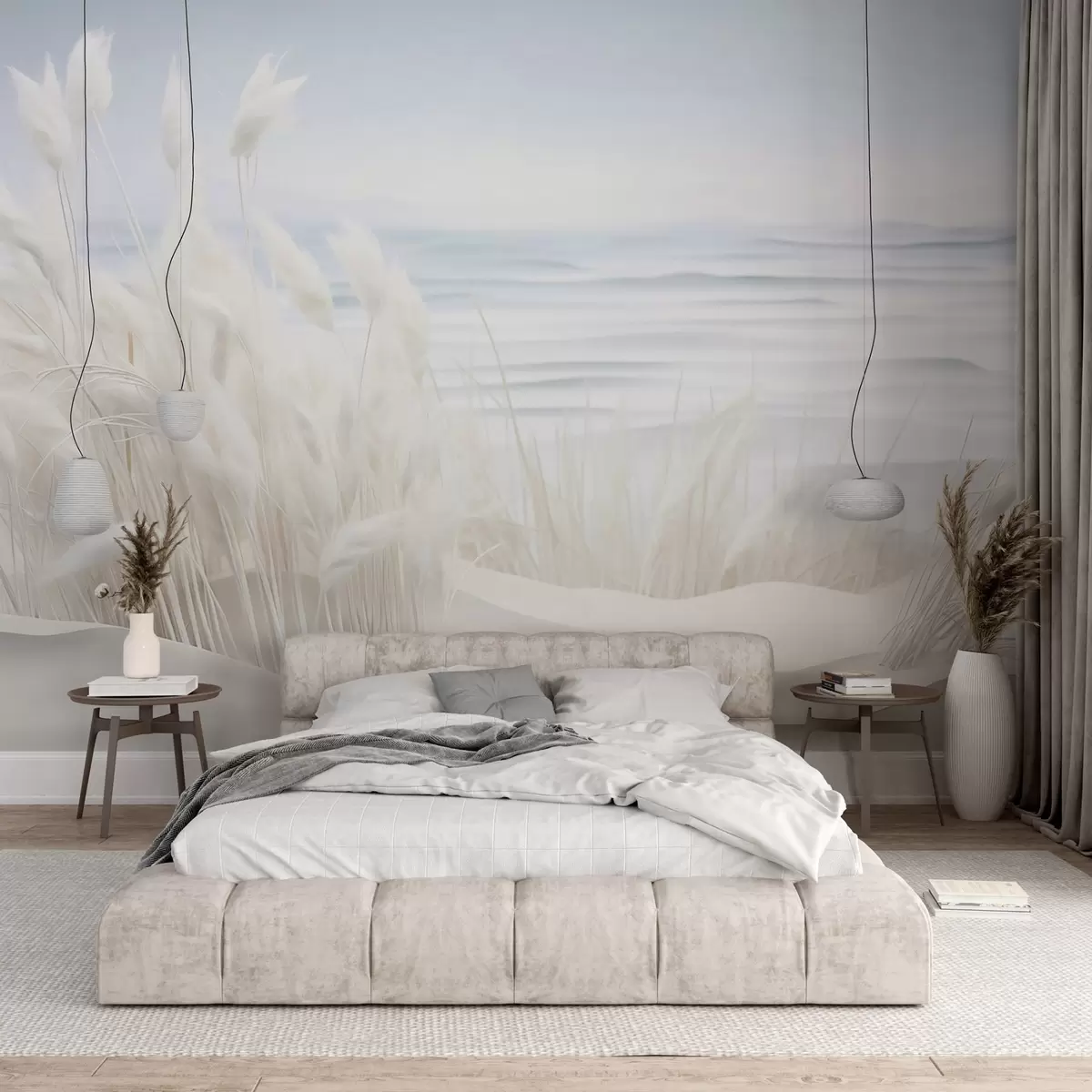 Papel tapiz Paisaje con hierba de pampa blanca sobre una duna de arena, con un océano azul claro de fondo, estilo suave y minimalista Nr. w09132
