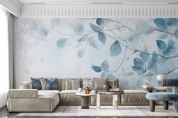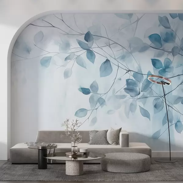 Papel tapiz Pintura en acuarela con textura imitando hojas y ramas azules, colores suaves, detalles delicados sobre fondo blanco Nr. w09133v1
