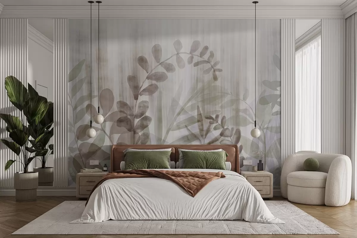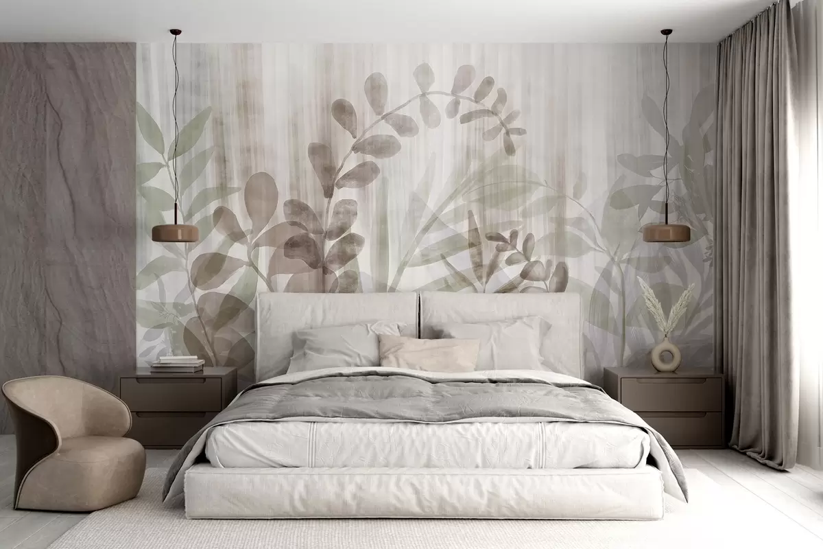 Papel tapiz Pintura acuarela imitación de plantas con hojas multicolores apagadas, fondo claro con líneas verticales, ilustración botánica Nr. w09146v1