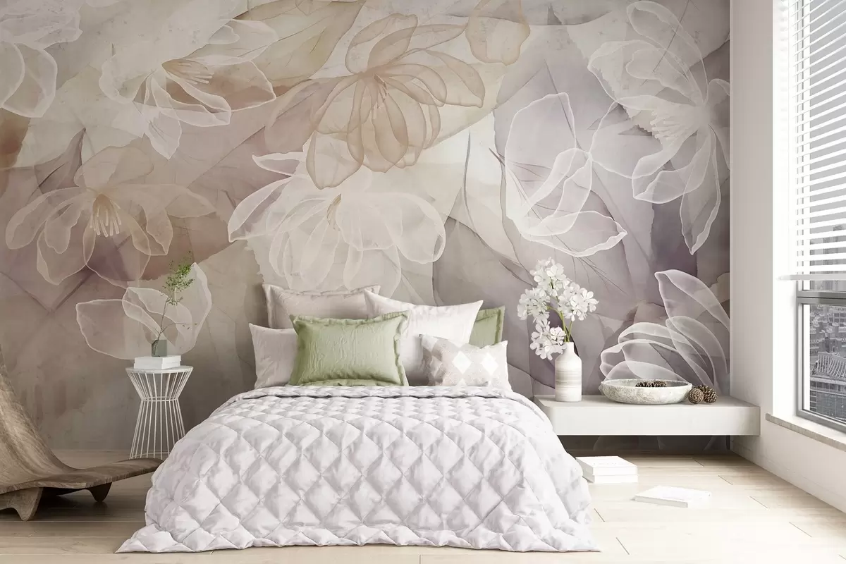 Papel tapiz Flores y hojas con pétalos transparentes en tonos blancos, beige y morados, suaves y delicados Nr. w09158