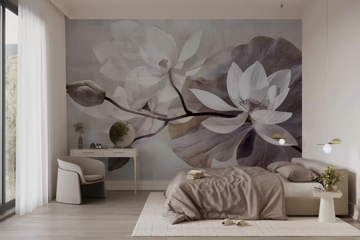 Papel tapiz Delicadas flores de loto con hojas y tallos en una suave paleta de colores beis Nr. w09159