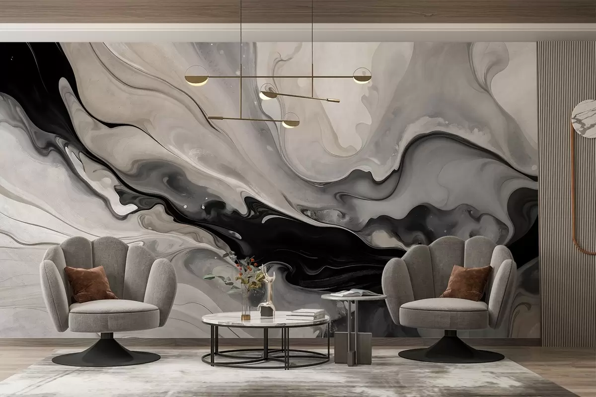 murales de pared Pintura abstracta de textura fluida en tonos negros, blancos, grises y beige imitación mármol w09160