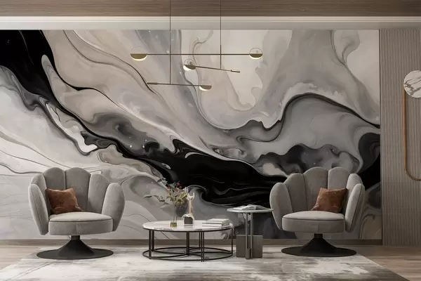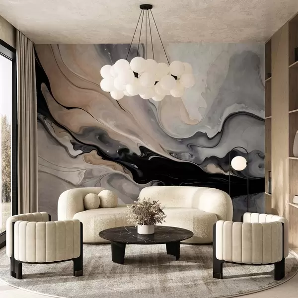 Papel tapiz Pintura abstracta de textura fluida en tonos negros, blancos, grises y beige imitación mármol Nr. w09160