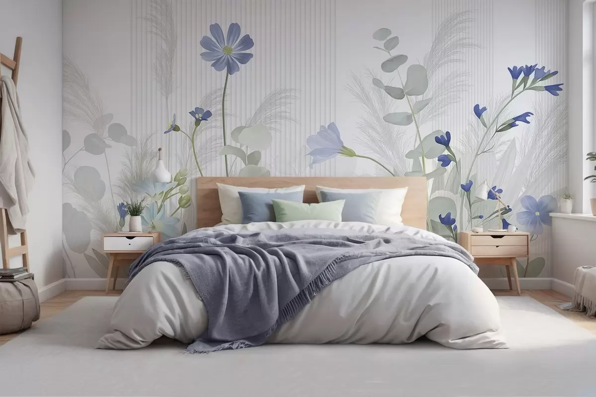 Papel tapiz Flores en colores pastel, hojas verde claro, fondo blanco con líneas verticales, elegante y minimalista Nr. w09161v1