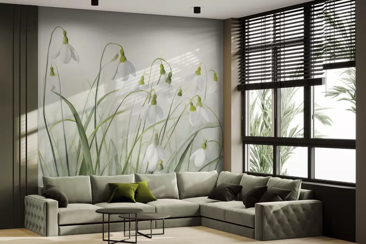 Papel tapiz Flores de campanillas de invierno con tallos y hojas de textura verde, estilo acuarela primaveral, pinceladas delicadas Nr. w09195