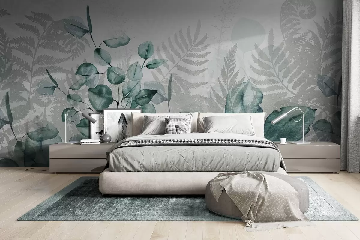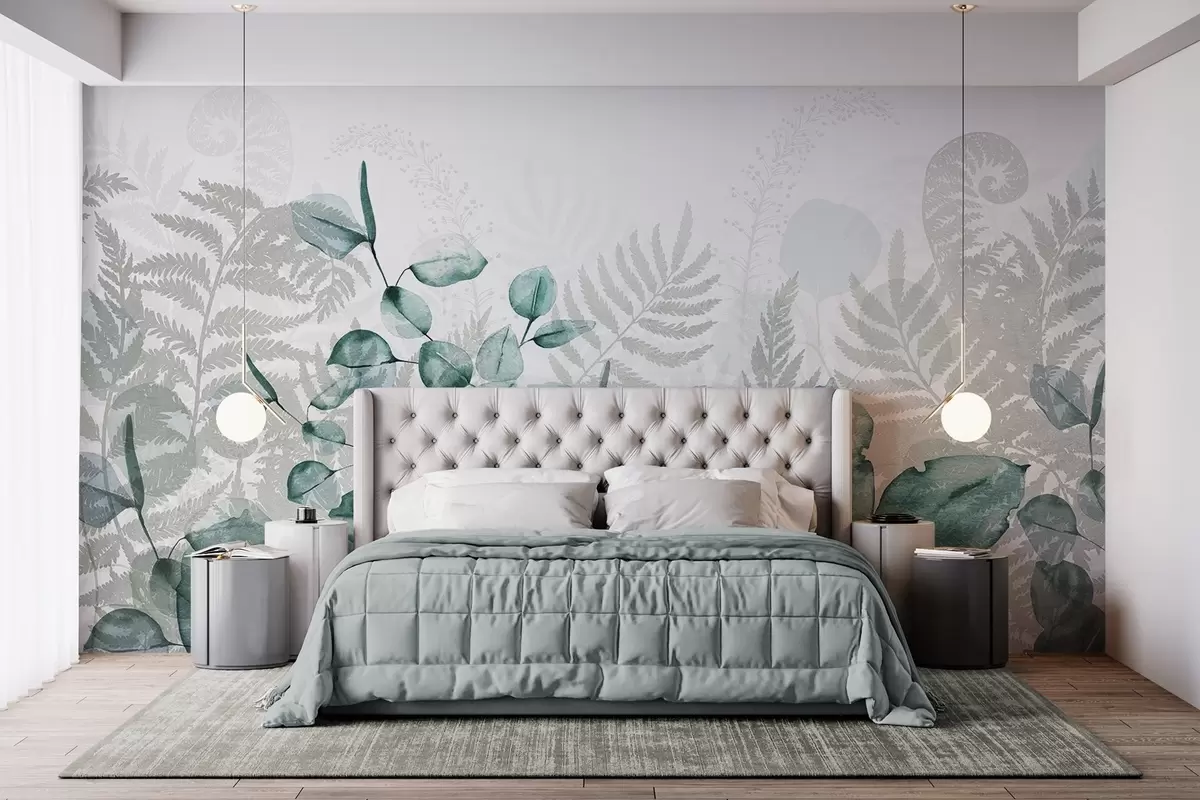 Papel tapiz Hojas de eucalipto y helecho en tonos verdes y grises, efecto acuarela , ilustración botánica Nr. w09197